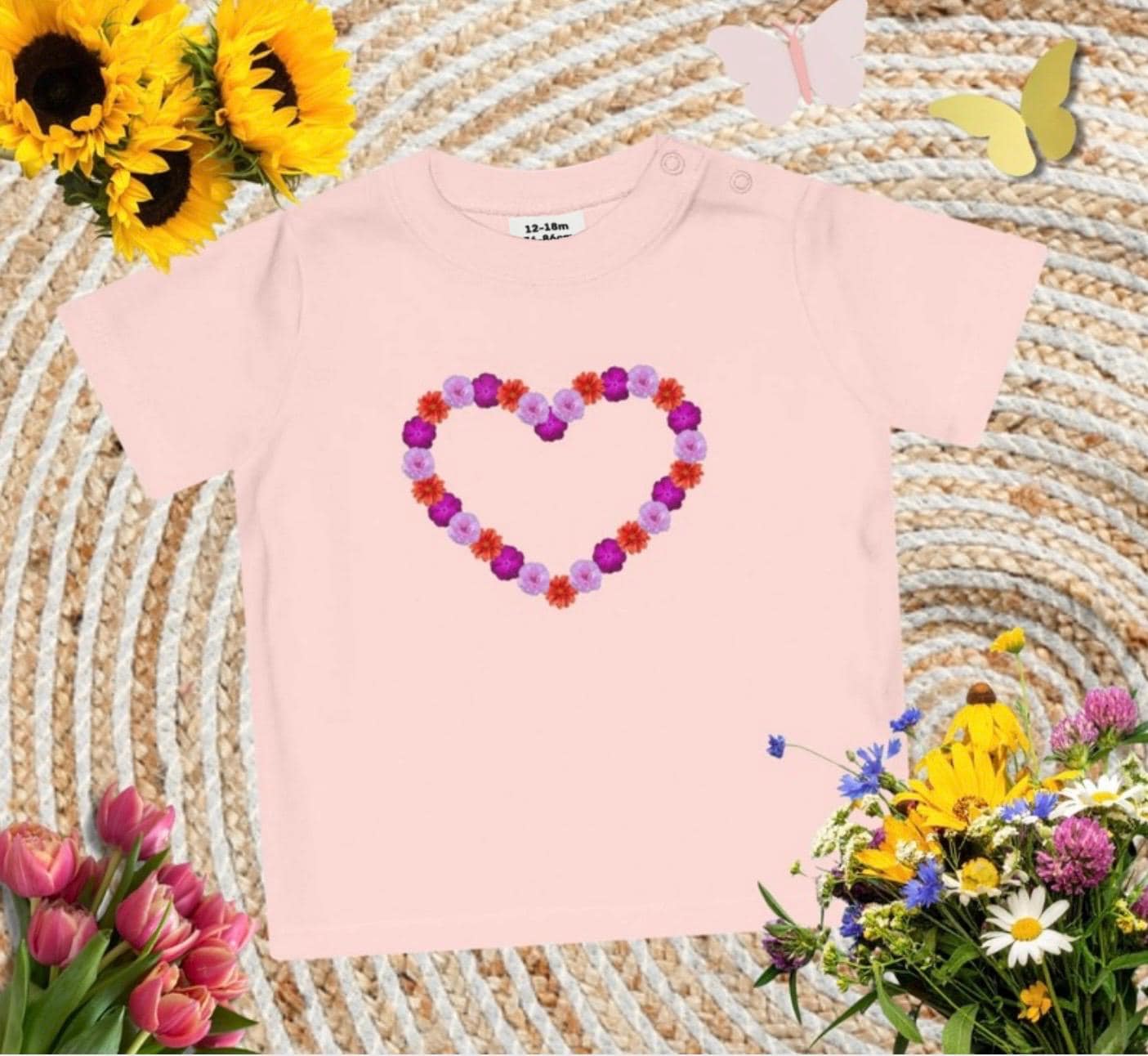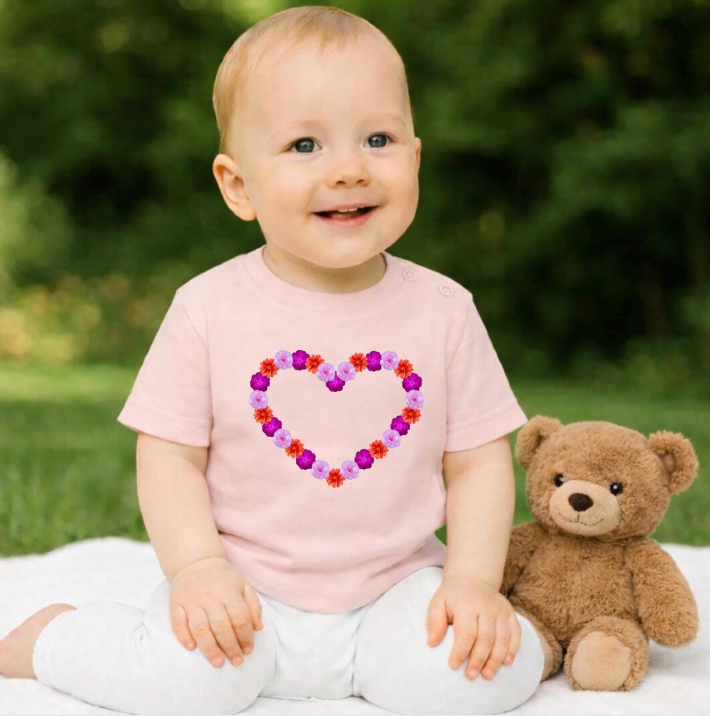 Are you looking for a gift as radiant and unique as a spring day? Many baby shirts rely on simple, standard designs. Our floral heart shirt is something truly special: The design is based on real flowers. It combines the beauty of nature with the softness of 100% organic cotton, perfect for delicate baby skin and special moments.