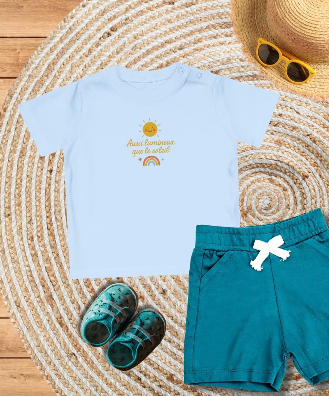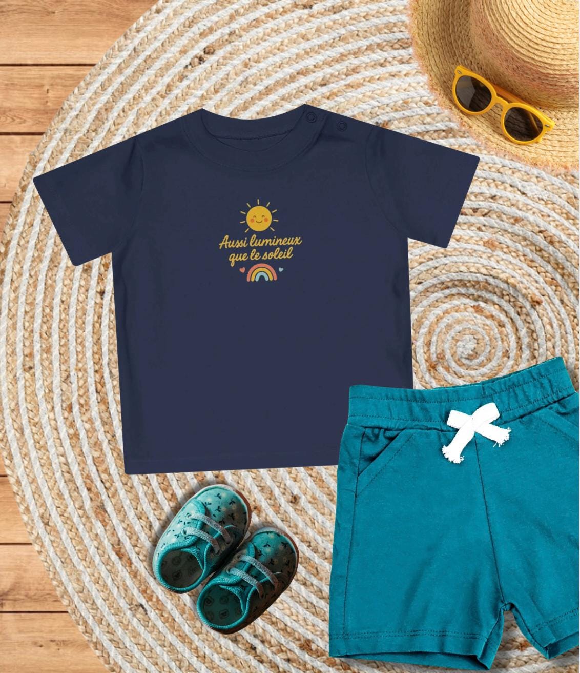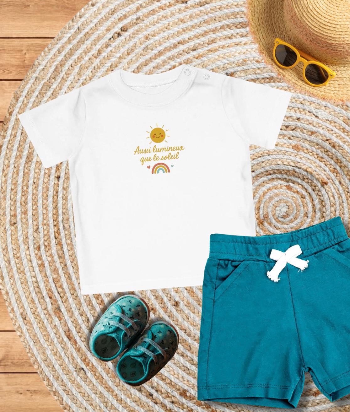 ☀️ Baby T-Shirt mit französischem Spruch „Aussi lumineux que le soleil“ – Bio-Baumwolle, Sonne & Regenbogen