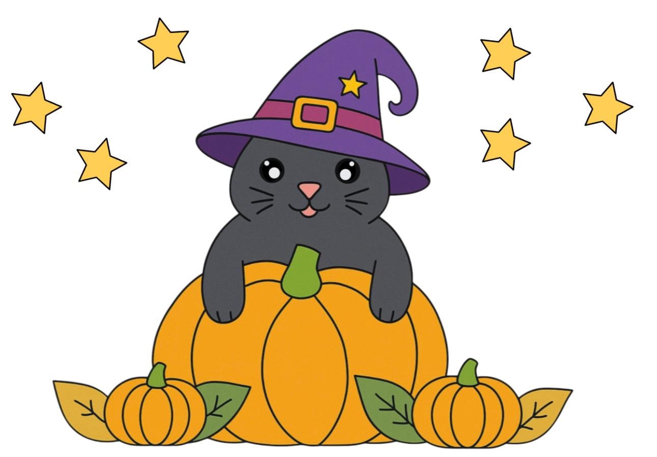 A cute cat wearing a witch's hat sits happily behind pumpkins. An autumnal yet playful motif that will light up children's eyes.