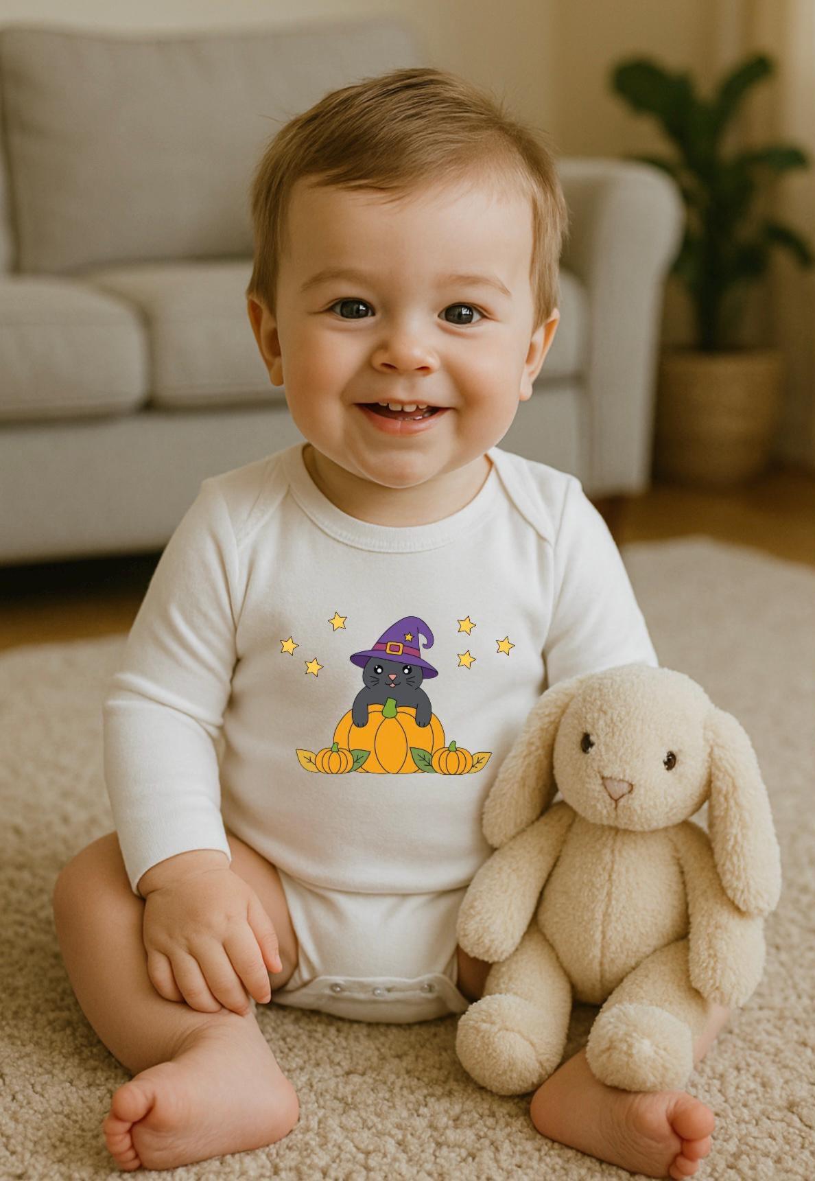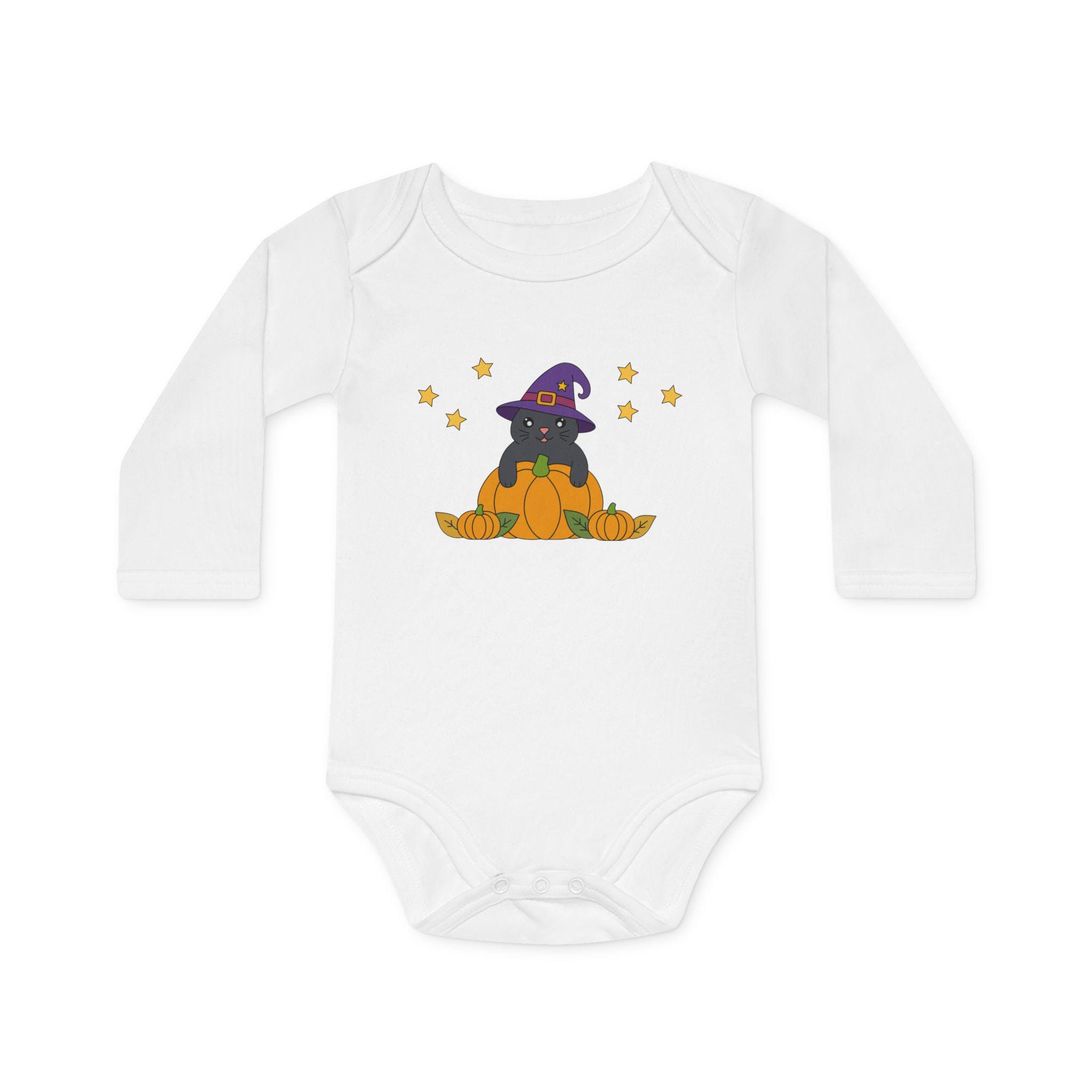 This simple, white long-sleeved bodysuit is not only wonderfully comfortable, but is also ideal for autumnal baby Halloween outfits or cozy days at home.