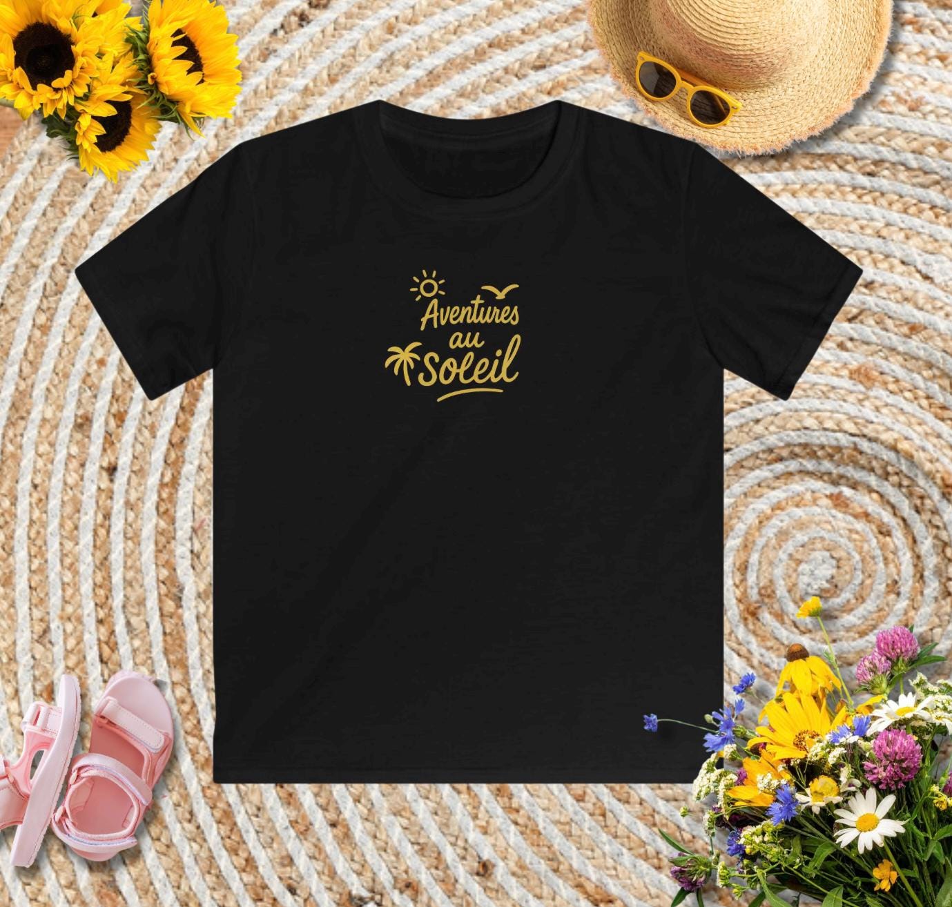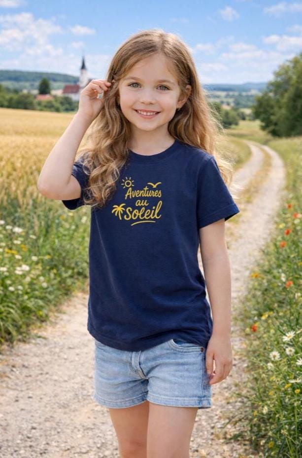 Ready for unforgettable summer moments? As the days get longer, little adventurers need clothes that can keep up with everything and look stylish at the same time. Our T-shirt with the gold lettering "Aventures au soleil" (Adventures in the Sun) combines playful lightness with a sophisticated look. Made from durable, soft cotton, it's the perfect companion for building sandcastles, eating ice cream, and family outings.