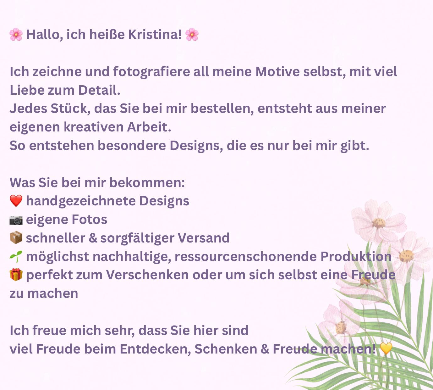 Alle Designs in meinem Shop entstehen mit ganz viel Liebe. Ich zeichne und gestalte jedes Motiv selbst, von der ersten Idee bis zum fertigen Design. So entstehen einzigartige Motive, die es nur hier gibt.