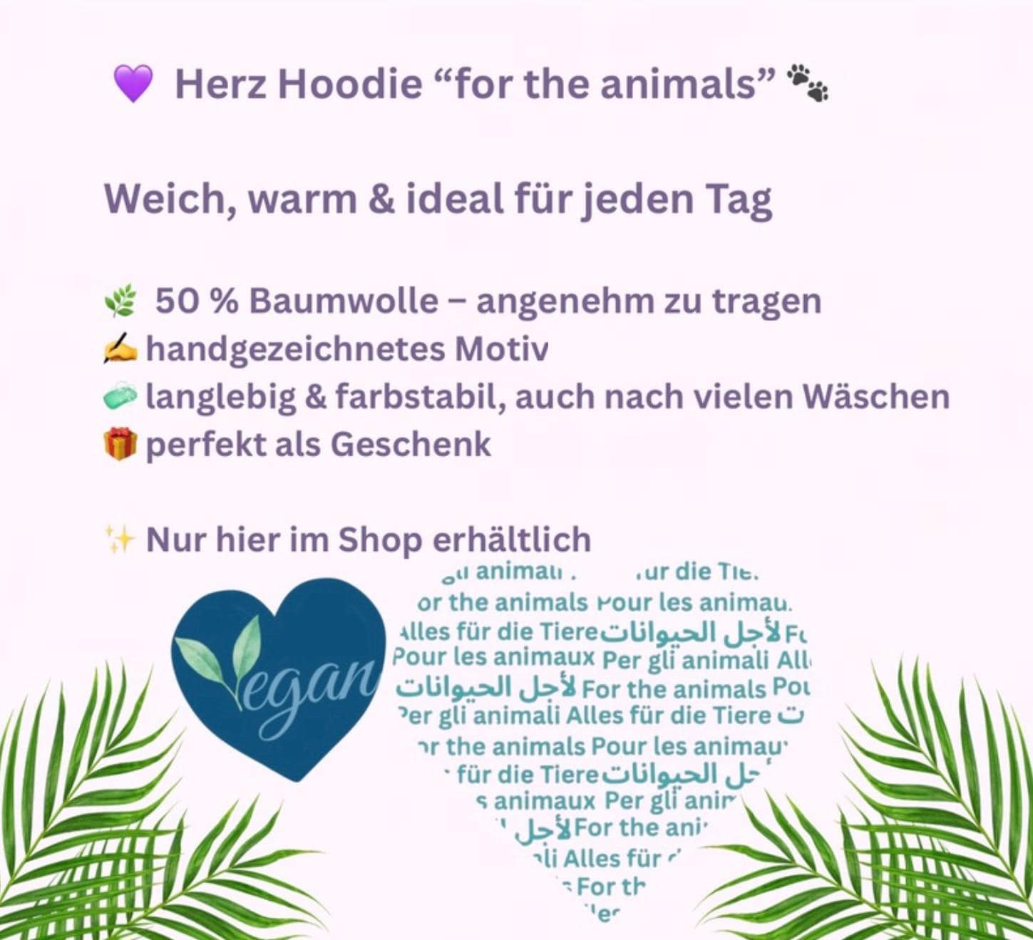Dieser hochwertige Hoodie vereint ein klares Statement mit maximalem Tragekomfort. Das Herzmotiv auf dem Rücken zeigt „For the animals“ in mehreren Sprachen, perfekt für alle, die ihren Lebensstil mit Stolz tragen möchten.