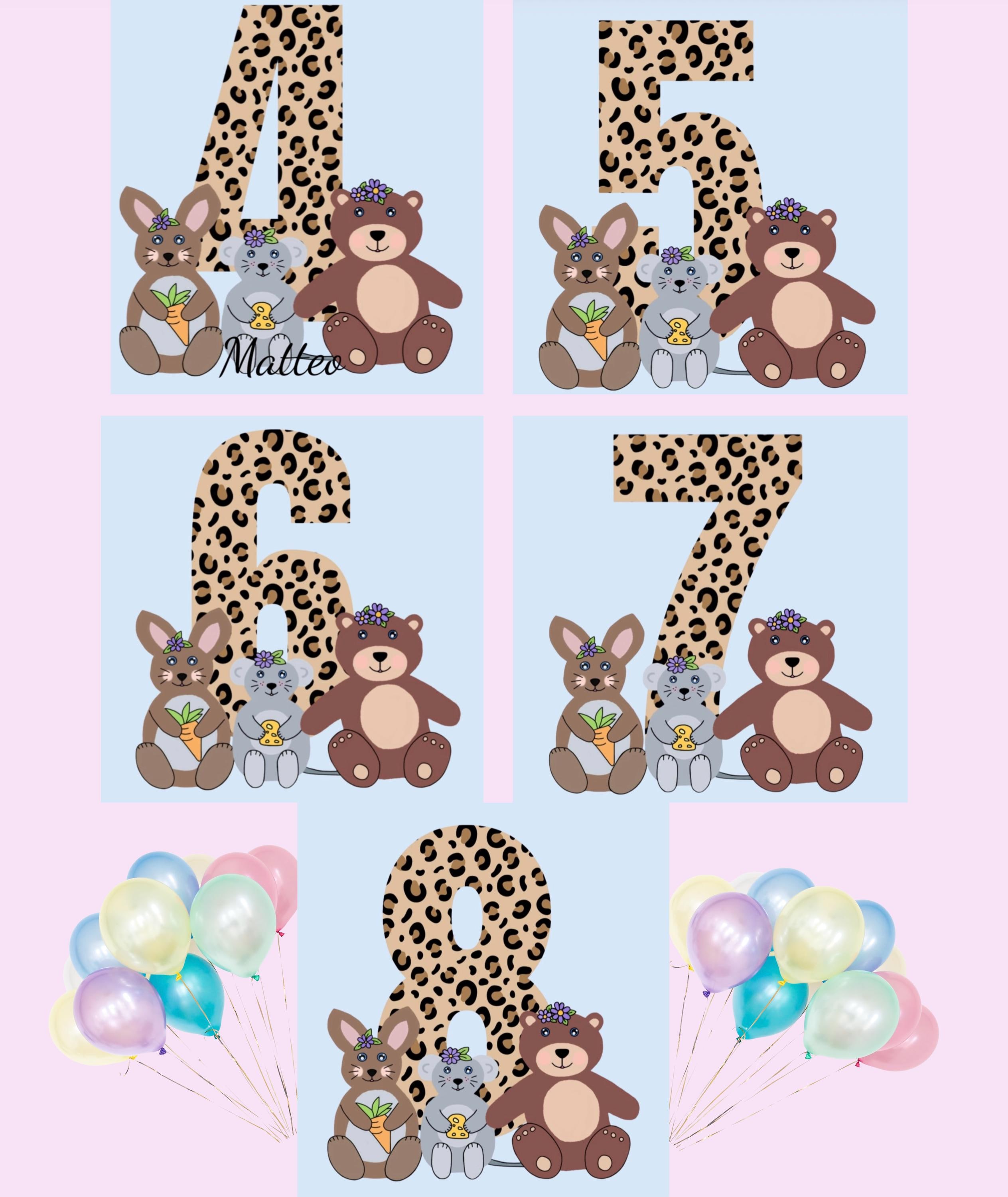 Die große Zahl mit trendigem Leopardenmuster wird von drei niedlichen Tierfreunden (Hase, Maus & Bär) begleitet, perfekt für kleine Geburtstagskinder.