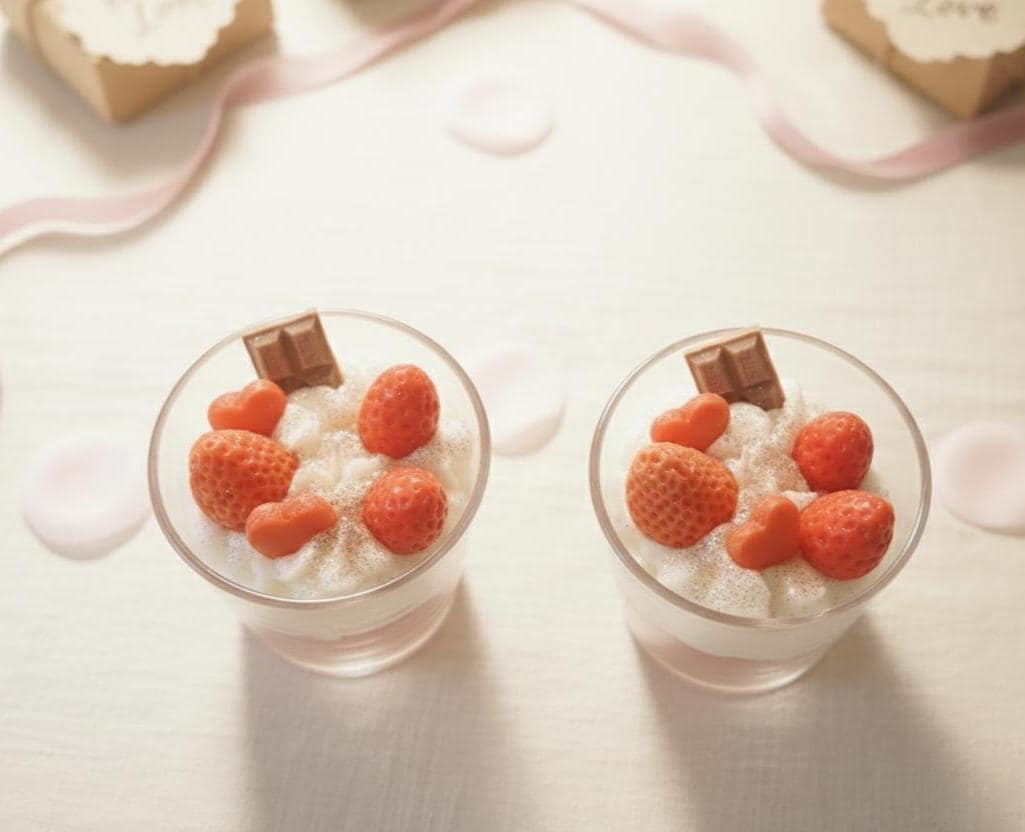 Detailreiche Erdbeeren, Herzen und Schokolade aus Sojawachs â wie ein echtes Dessert angerichtet.